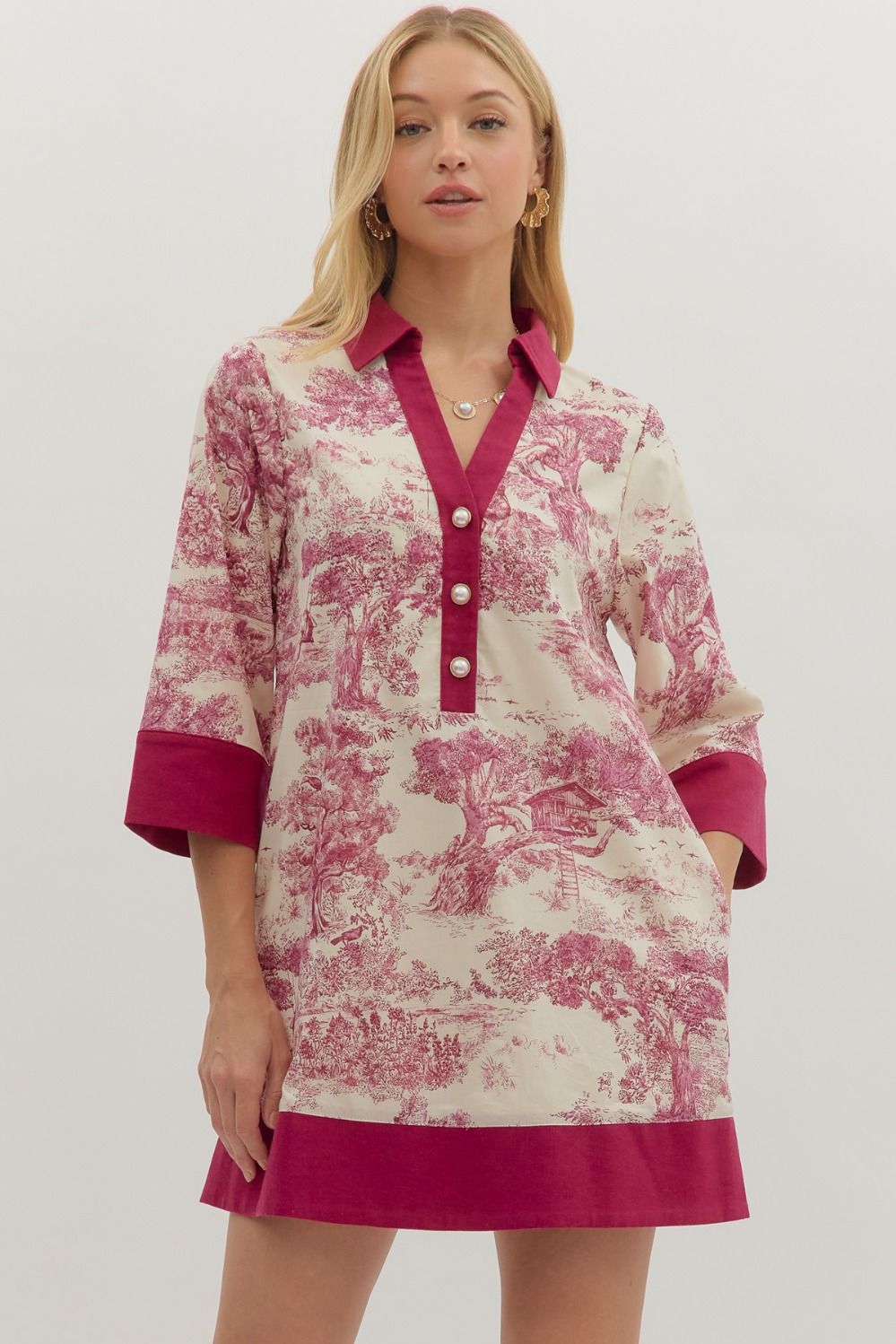 Entro Toile Print 3/4 Sleeve Mini Dress In Burgundy