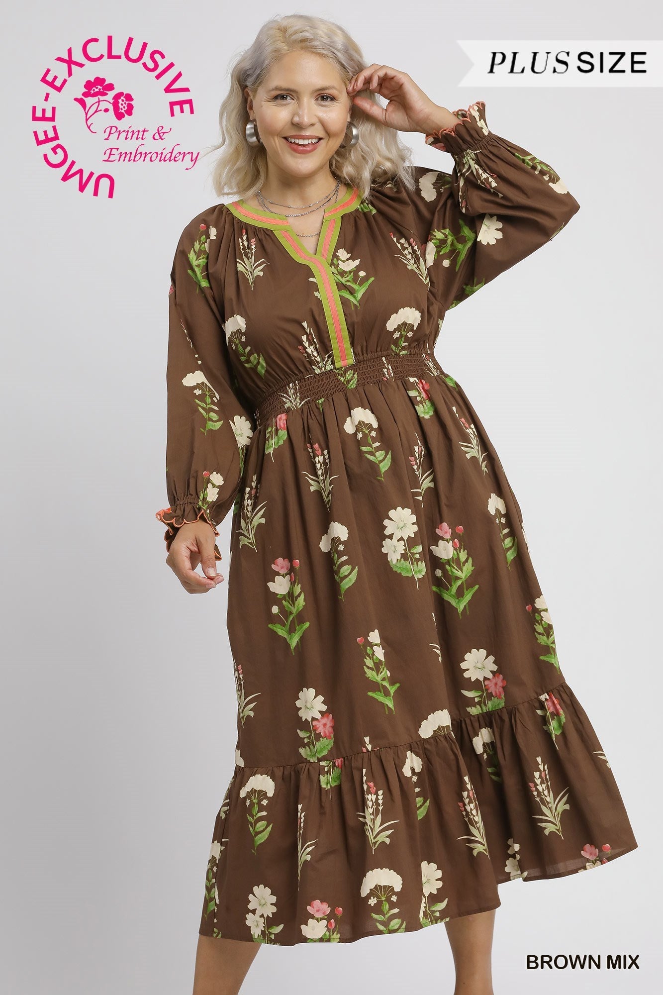 Umgee Floral V Neck Ruffle Midi Dress In Brown PLUS Sizes