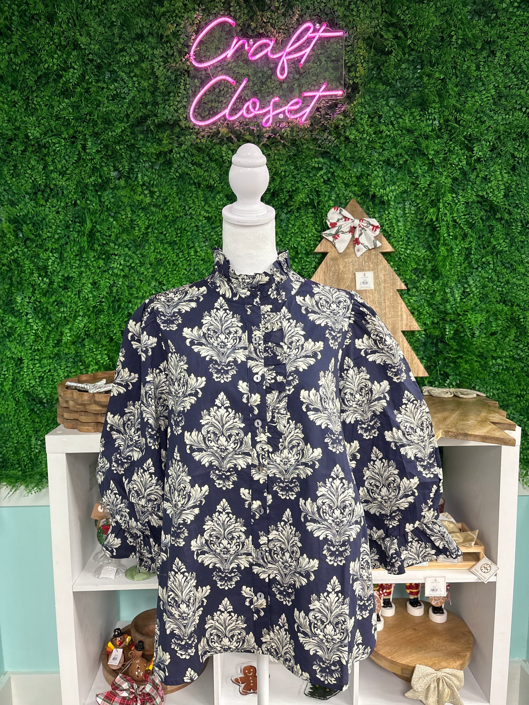 Entro Baroque 3/4 Ruffle Cuff Top In Navy