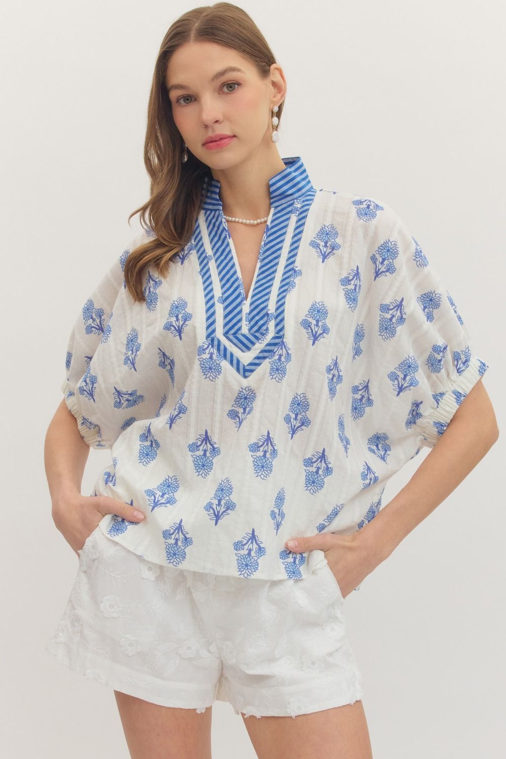 ENTRO Botanical Print Short Sleeve Dolman Top In Blue *COMING SOON*