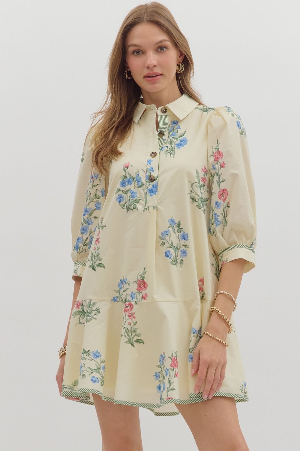 ENTRO Entro Floral Cuff3/4 Sleeve Mini Dress In Cream