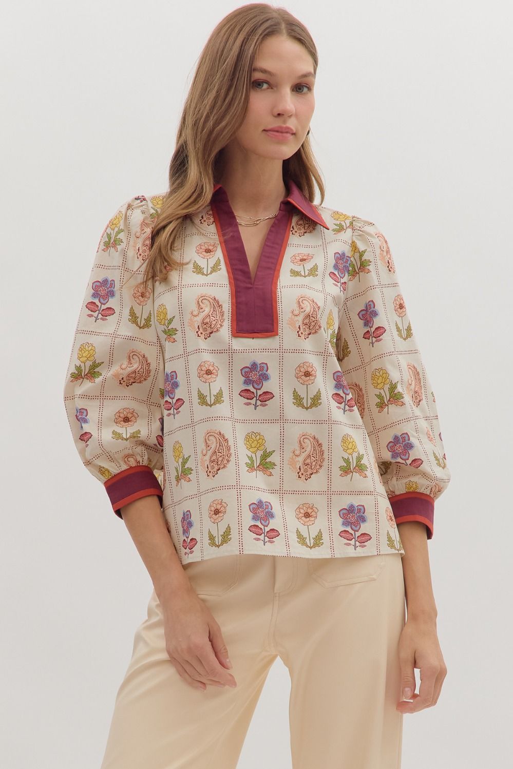 ENTRO Floral Block Print 3/4 Sleeve Top In Ecru