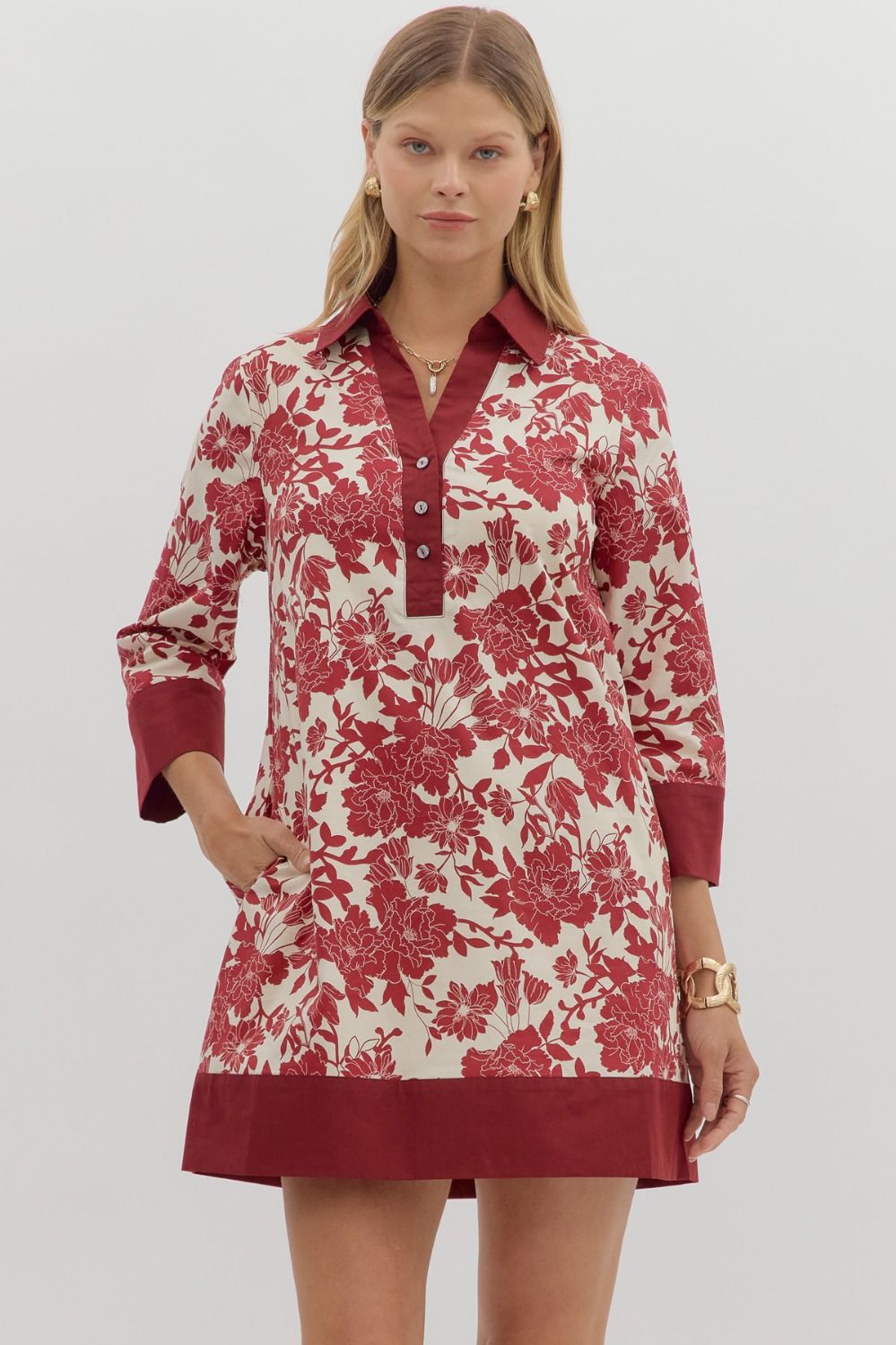 ENTRO Floral Print 3/4 Sleeve Mini Dress With Contrast Binding In Burgundy