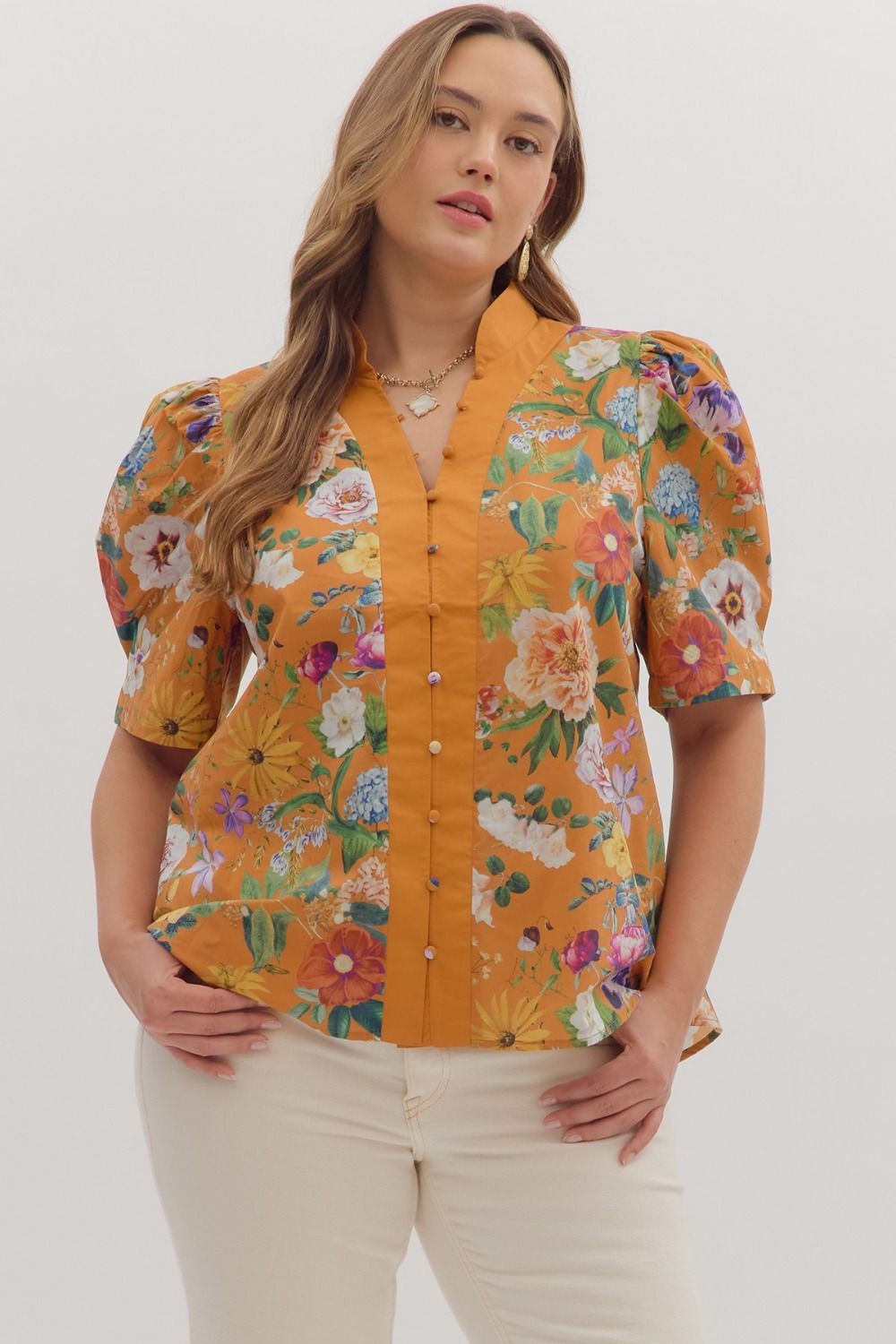 Entro Floral Print Puff Sleeve Button Down Top In Pumpkin PLUS Sizes
