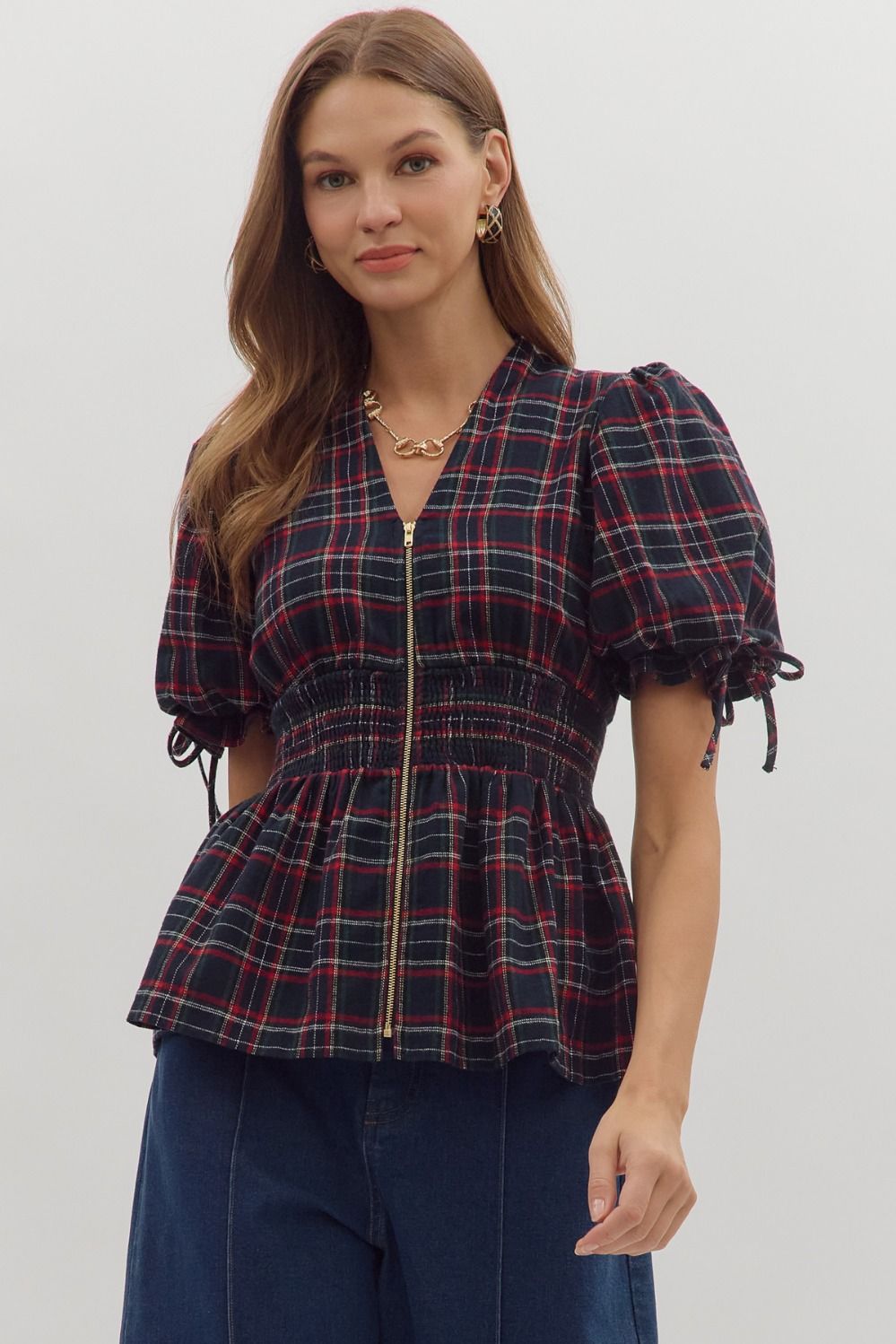 Entro Plaid Puff Sleeve Smocked Waist Top In Navy