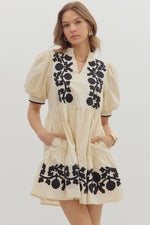 ENTRO Puff Sleeve Mini Dress With Embroidered Details In Ecru
