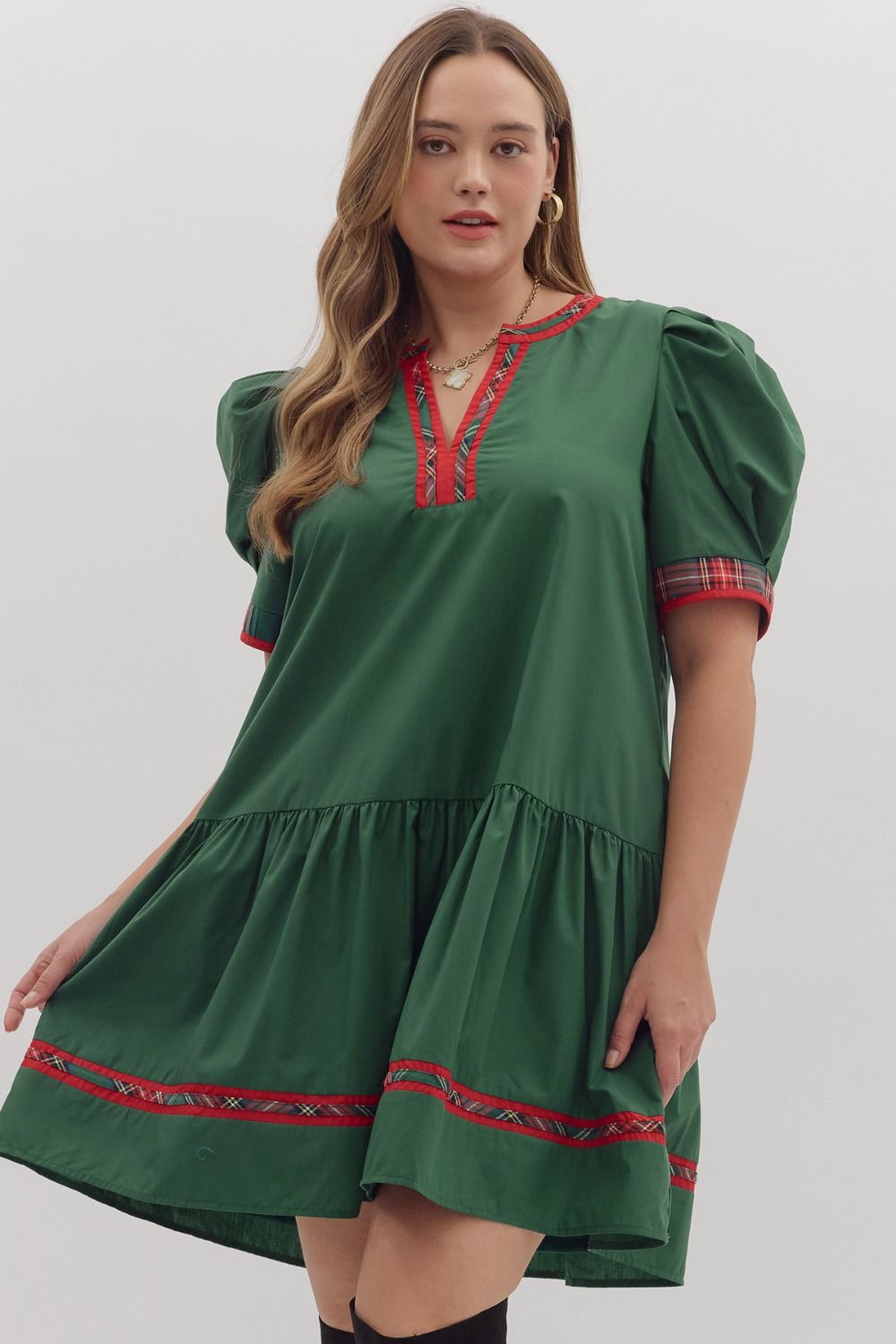 Entro Puff Sleeve Mini Dress With Plaid Trim In Green PLUS Sizes