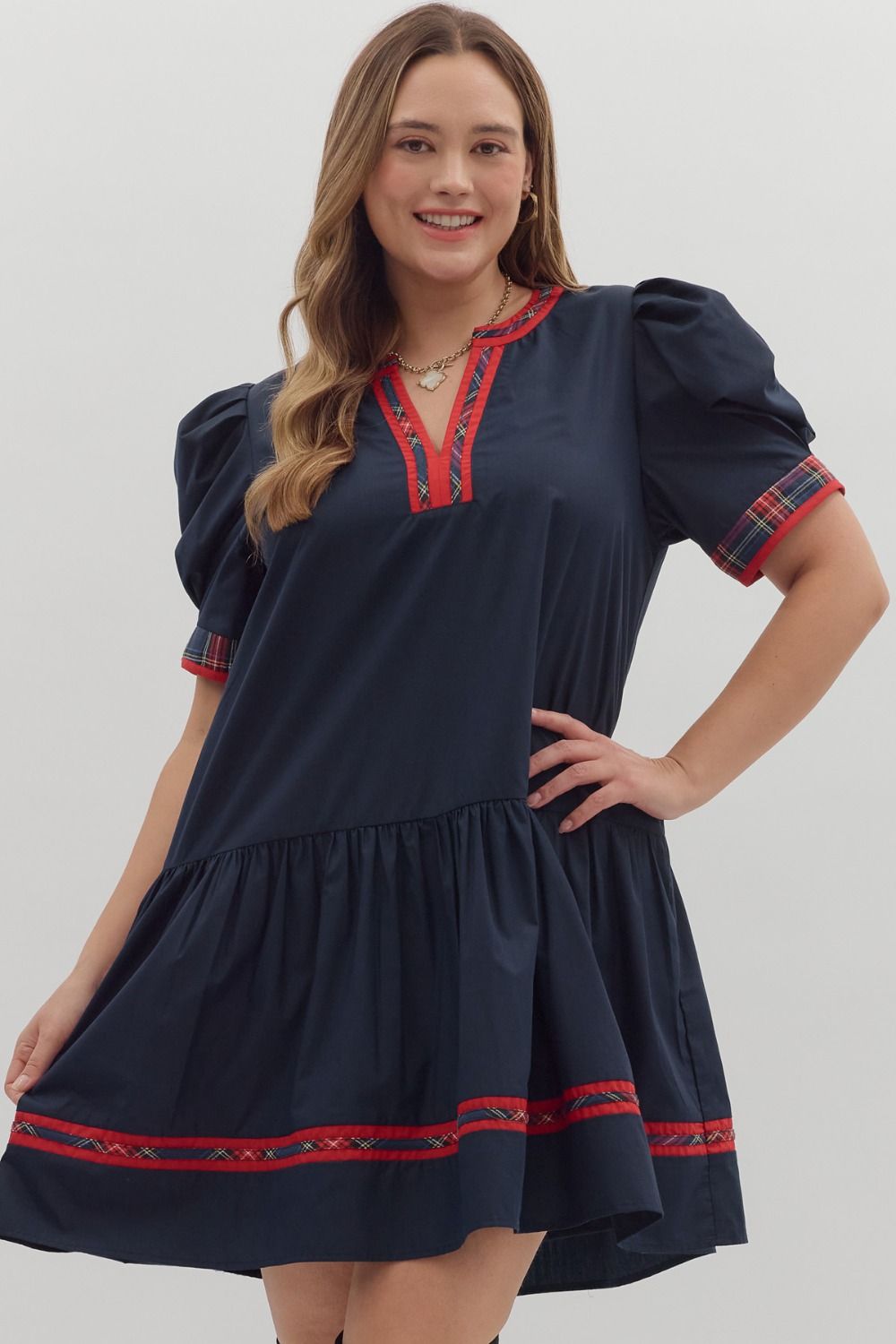 Entro Puff Sleeve Mini Dress With Plaid Trim In Navy PLUS Sizes