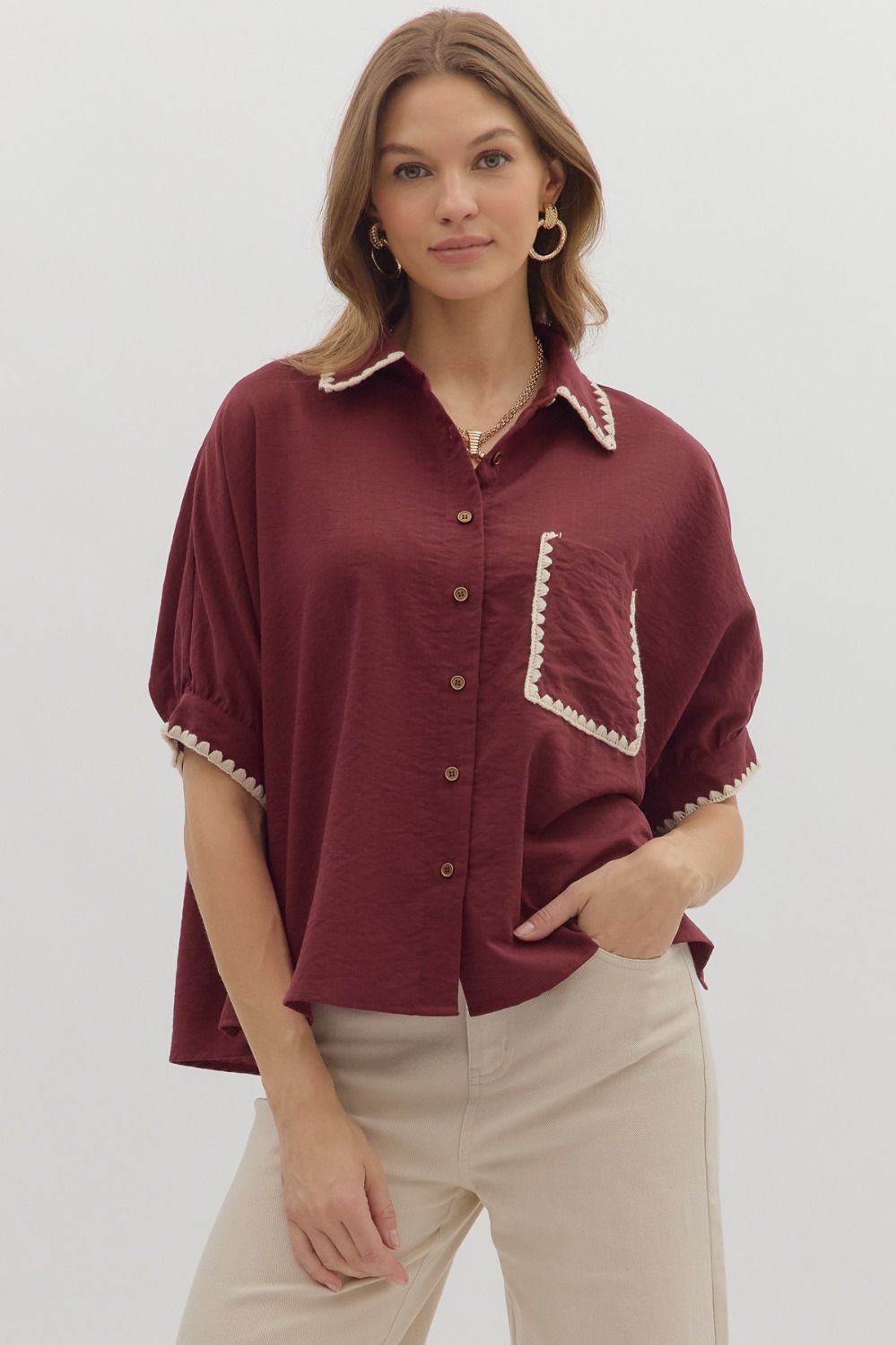 ENTRO Short Sleeve Dolman Top With Embroidered Trim In Burgundy