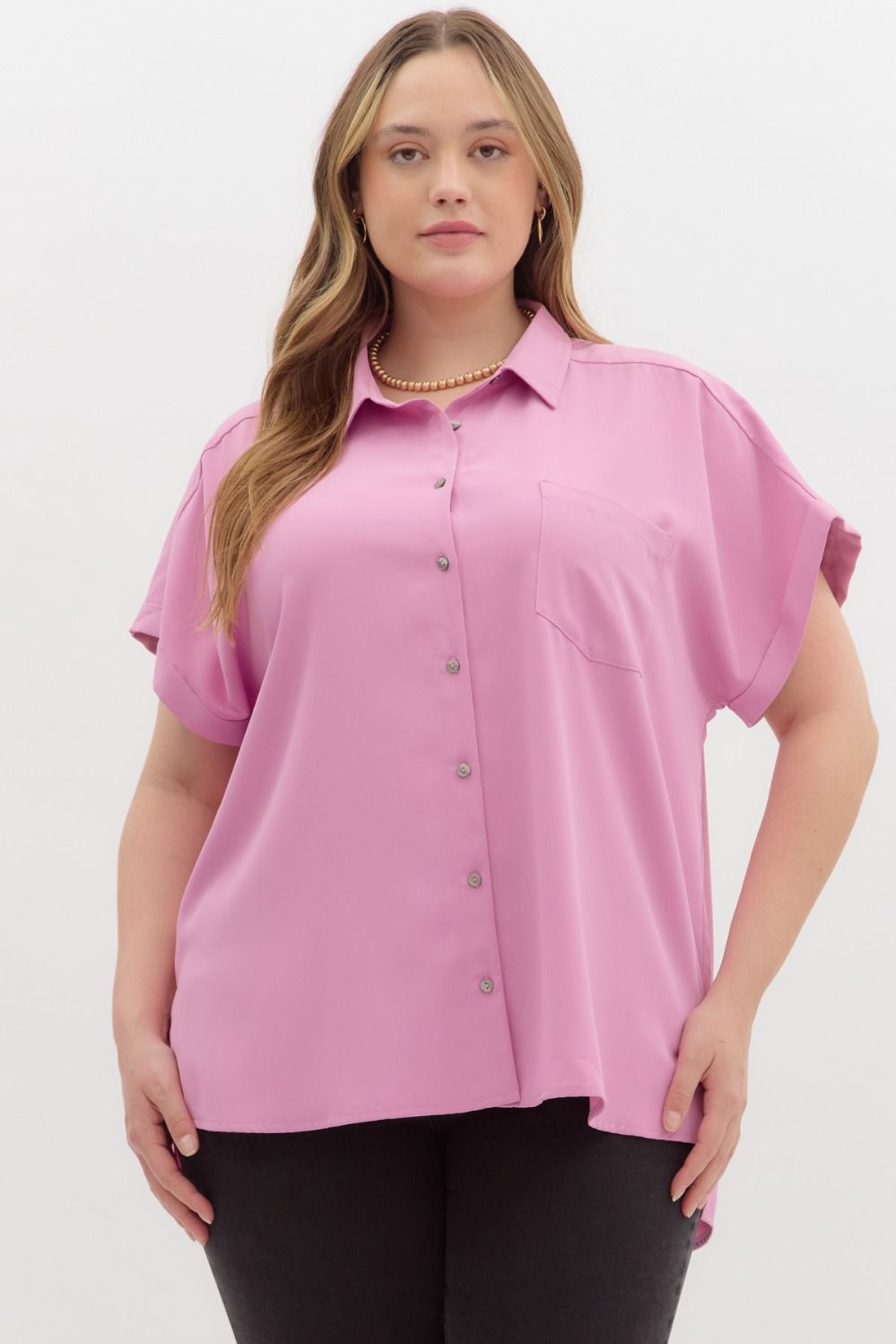 Entro Solid Button Down Collared Top In Pink PLUS Sizes