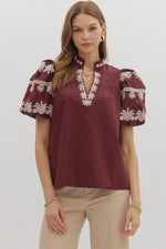ENTRO Solid Embroidered Sleeve & Trim Top In Burgundy