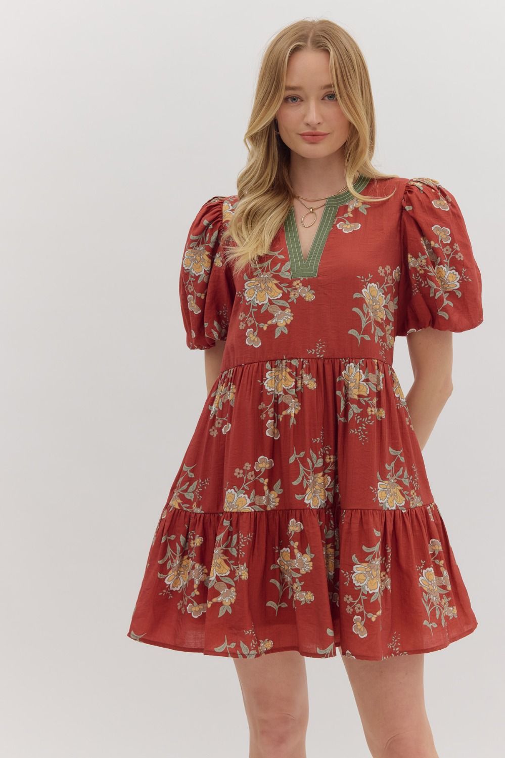 ENTRO Floral Print Mini Dress With Contrast Binding In Brick