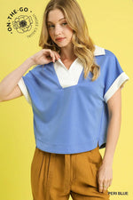 Umgee Luxeknit Contrast Collar Polo Knit Top In Peri Blue *FINAL SALE*
