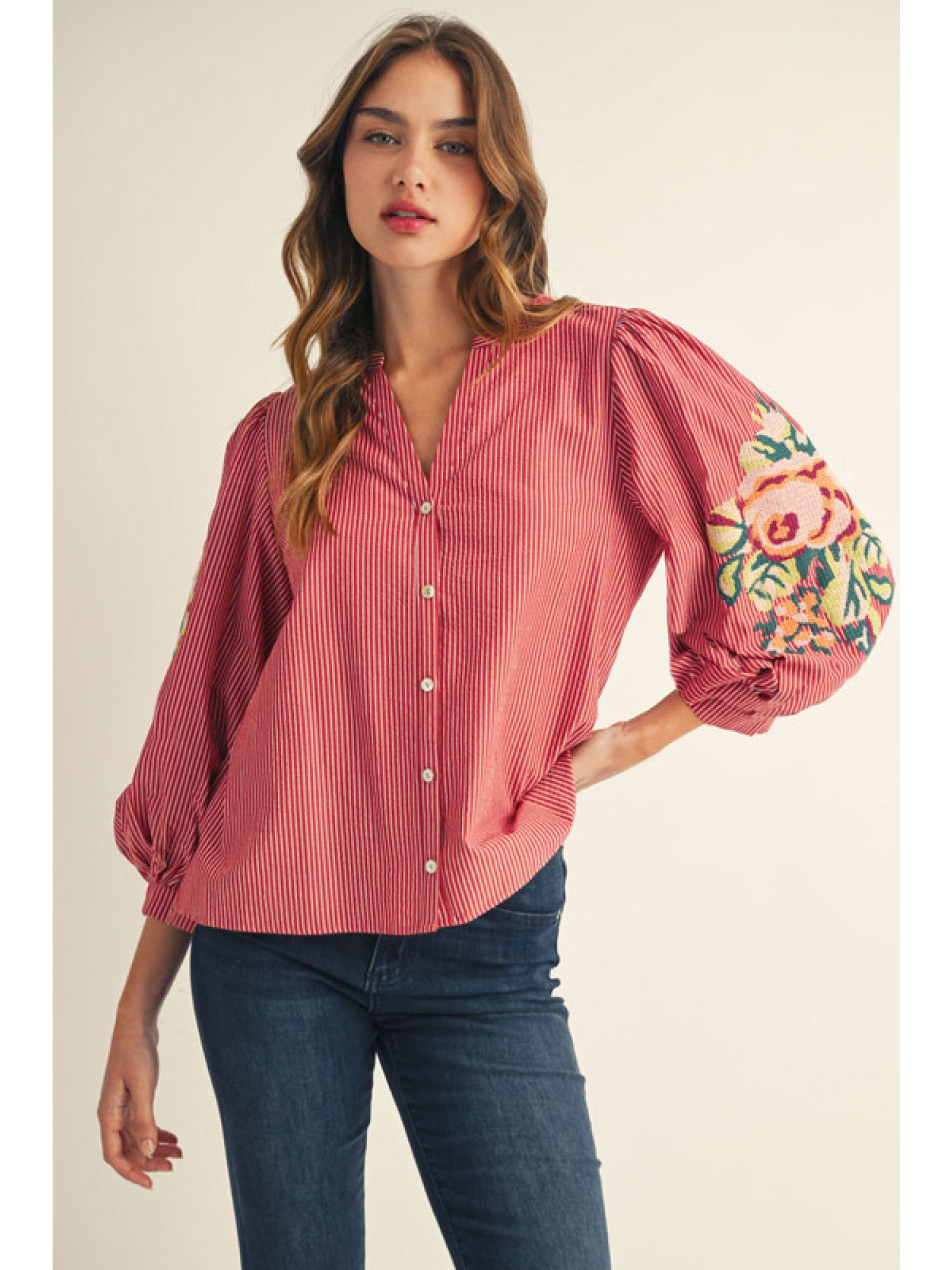 Jodifl Embroidered Puff Sleeve Button Down In Red