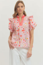 ENTRO Floral Print Tiered Flutter Sleeve Top In Pink