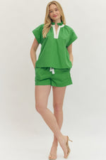 Entro Solid Short Sleeve Top With Contrast Trim V Neck In Green