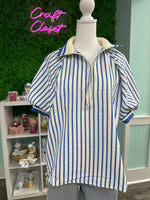 Entro Striped Puff Short Sleeve Top With Contrast Trim Collar In Blue