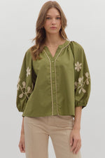 ENTRO 3/4 Embroidered Sleeve Button Down Top In Olive
