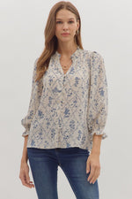 Entro Floral Print Long Sleeve Ruffle Neck Top In Ecru