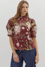 ENTRO Floral Print Ruffle Button Front In Merlot