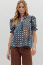 ENTRO Floral Ruffle Edge V Neck Top In Chambray