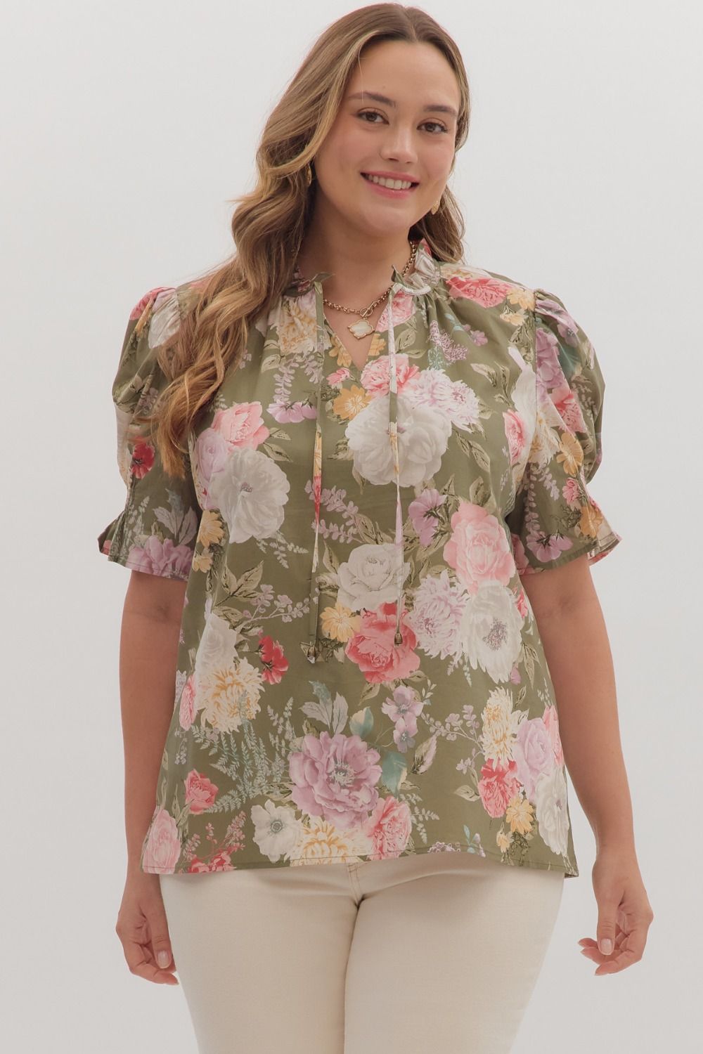 ENTRO Floral Smocked Band V Neck Top In Olive PLUS Sizes