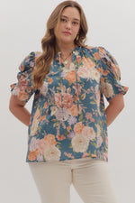 ENTRO Floral Smocked Band V Neck Top In Slate PLUS Sizes