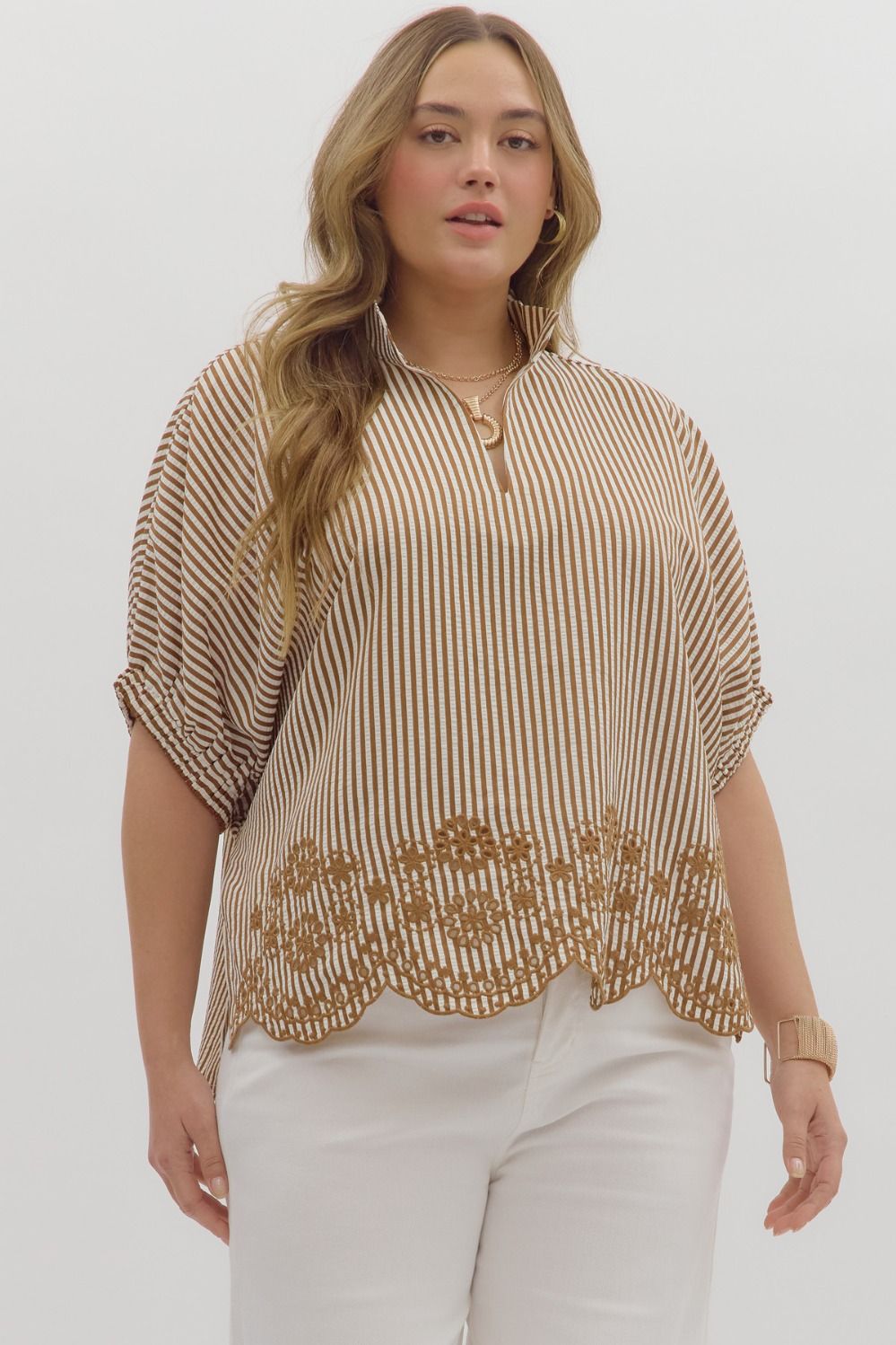 Entro Striped Dolman Top With Embroidered Scalloped Trim In Caramel PLUS Sizes