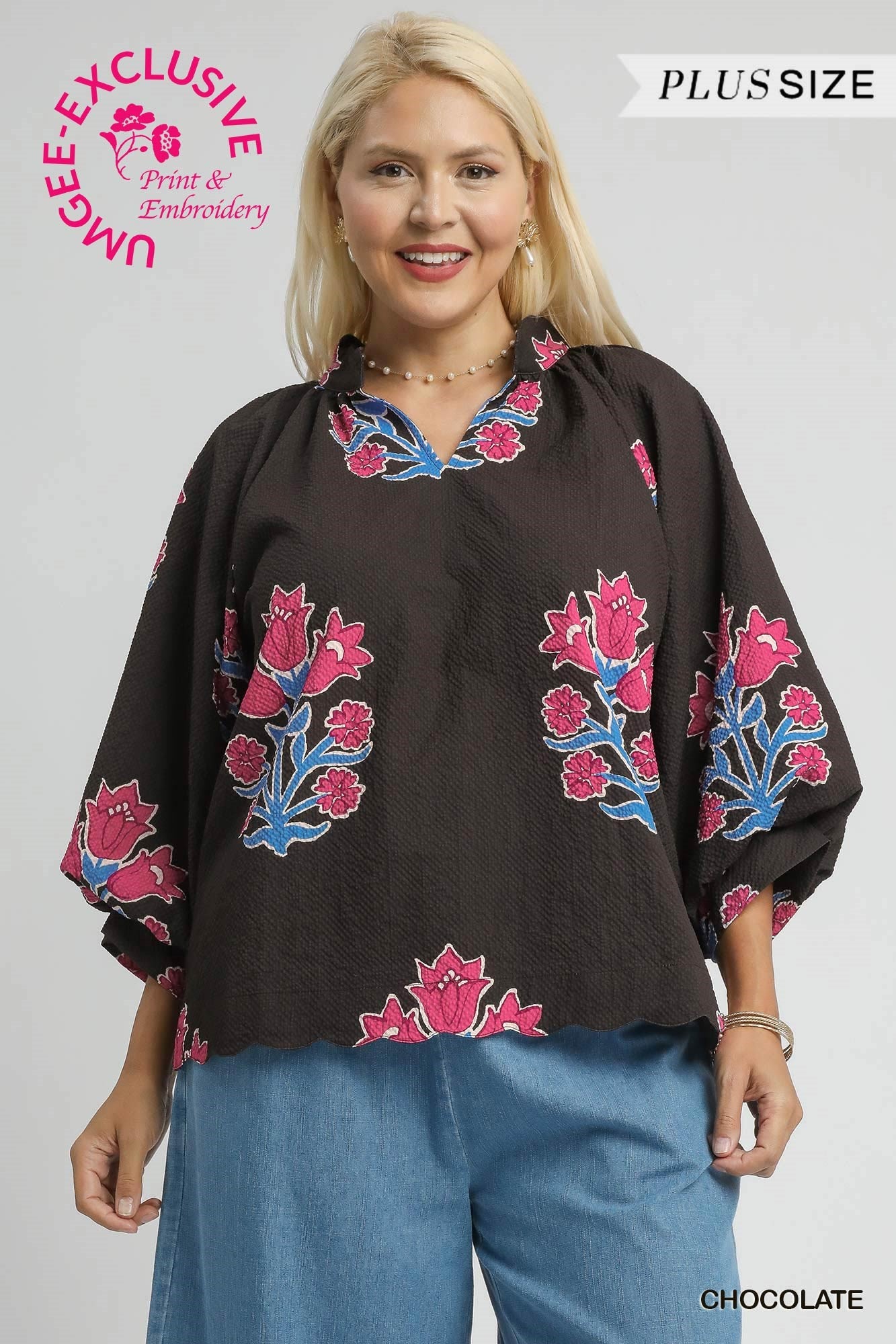 Umgee Bubble Sleeve Tulip Print Top PLUS Sizes In Chocolate