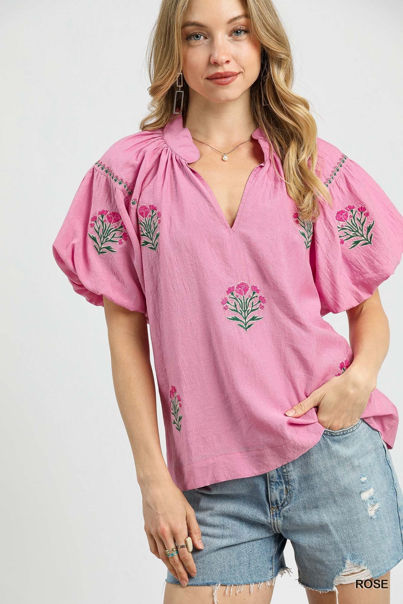 Umgee Floral Embroidered Puff Sleeve Top In Rose