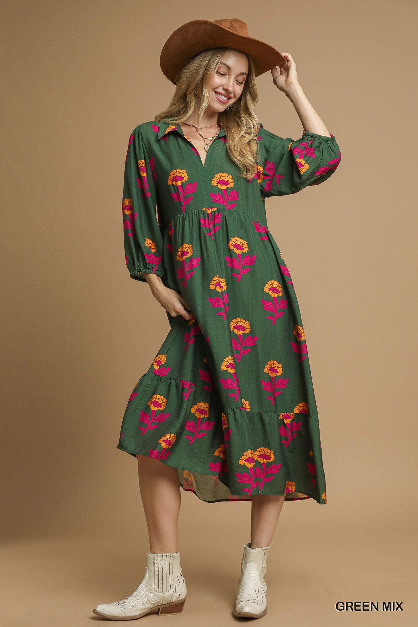 Umgee Floral Print Maxi Dress With Bubble Sleeves In Green Mix
