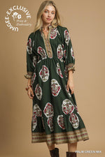 UMGEE Flower Patch Boarder Print V Neck Midi Dress In Palm Green Mix