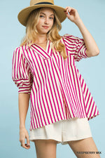 Umgee Striped Puff Sleeve Top With Wide Collar In Raspberry