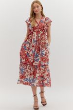ENTRO Botanical Ruffle Sleeve Midi Dress In Red Bean