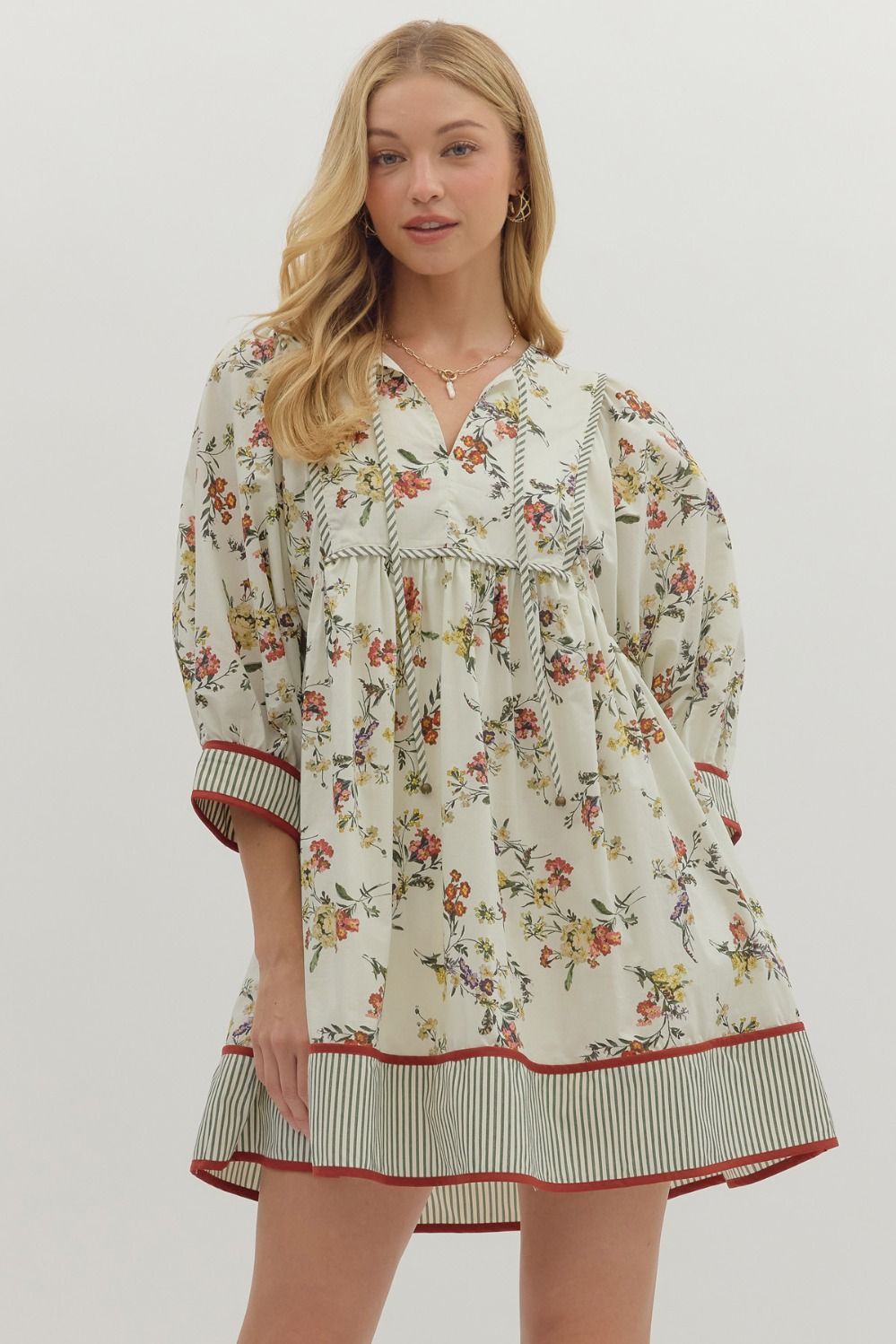 ENTRO Floral 3/4 Sleeve Contrast Trim Mini Dress In Ecru