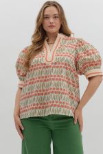 ENTRO Floral Pattern Cuff Band Puff Sleeve Top In Ecru PLUS Size