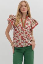ENTRO Floral Ruffle Sleeve Top In Rust
