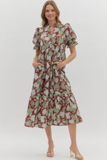 ENTRO Puff Sleeve Midi Dress in Burgundy Floral