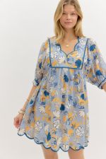 ENTRO Scalloped Cuff Sleeve Mini Dress In Slate Blue