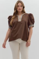ENTRO Solid Leopard Trim Top In Brown IN PLUS Sizes