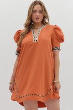 Entro Solid Pleated Puff Sleeve Mini Dress With Animal Print Accents PLUS Sizes In Rust