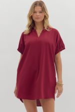 ENTRO Solid V Neck Mini Dress In Burgundy