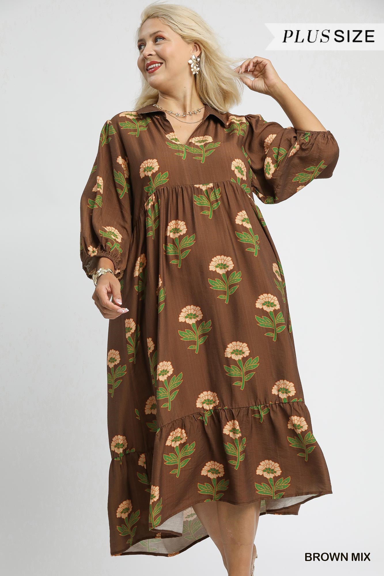 UMGEE Floral Maxi With Bubble Sleeves In Brown PLUS Sizes