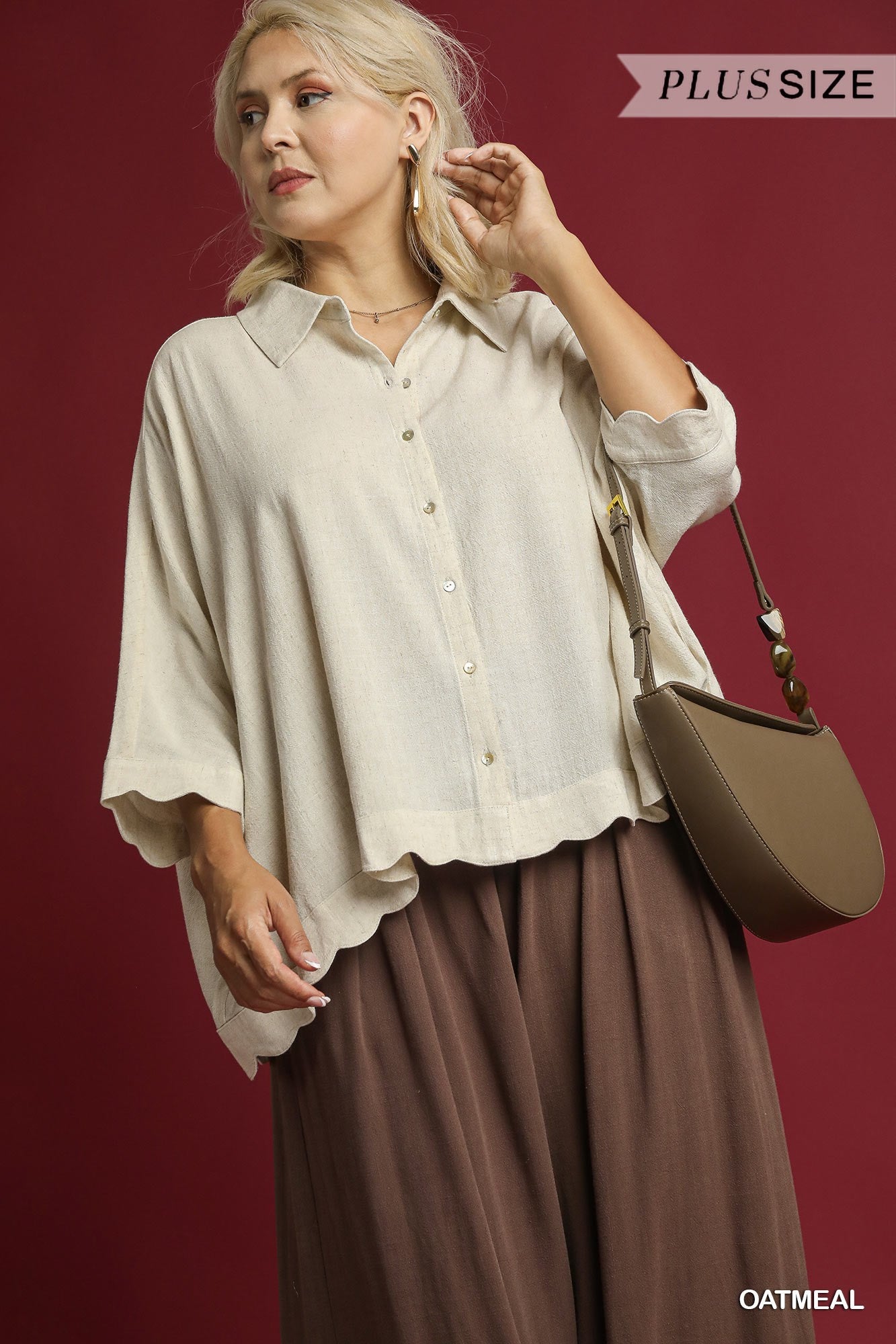 UMGEE Linen Scallop Hem Button Down In Oatmeal PLUS Sizes