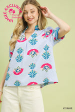 Umgee Puff Sleeve Contract Trim Floral Top In Light Blue