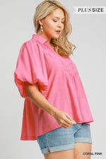 Umgee Smocked V Neck Puff Sleeve Top In Coral Pink PLUS Sizes *COMING SOON*
