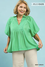 Umgee Smocked V Neck Puff Sleeve Top In Mint Green PLUS Sizes *COMING SOON*