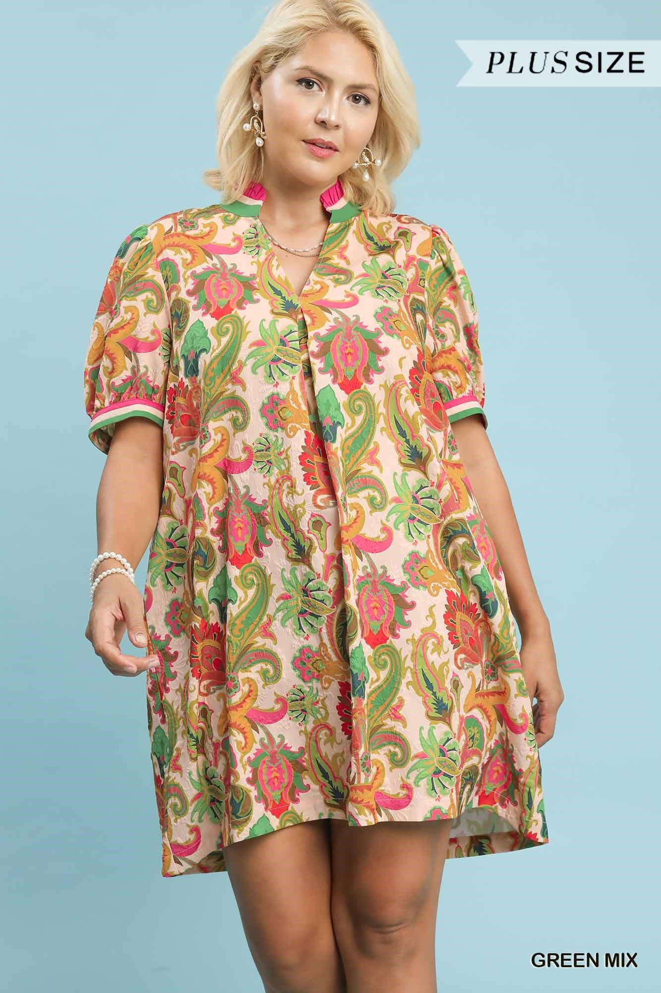 Umgee Jacquard Abstract Print Mini Dress In Green Mix PLUS Sizes *COMING SOON*