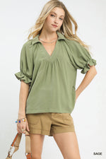 Umgee Solid Collared V Neck Top In Sage *COMING SOON*