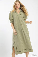Umgee Striped Midi Dress With Puff Sleeves In Light Olive *COMING SOON*